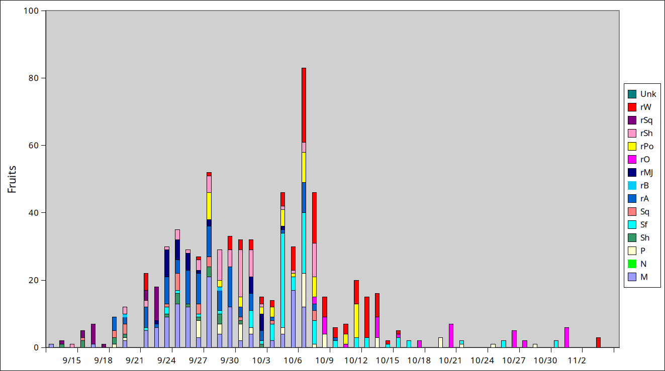 This year's harvest was slightly smaller than last year's: 739 fruits for 242 lb (assuming same average weight as in past seasons), Sep 13 to Nov 4, with the main harvest mid-September to mid-October.